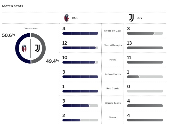 ม้าลาย ยูเวนตุส ผลงานยอดเยี่ยมได้ ฮวน คาบัล ลงสำรองปลดล็อคโขกประตูชัยนาที 64 ให้ทีมบุกไปเอาชนะทีมแกร่งอย่างโบโลญญ่า ได้ถึงถิ่น 1-0 เก็บ 3 คะแนนแซงเจ้าถิ่นขยับขึ้นมาอยู่ที่ 5 บนตารางคะแนน