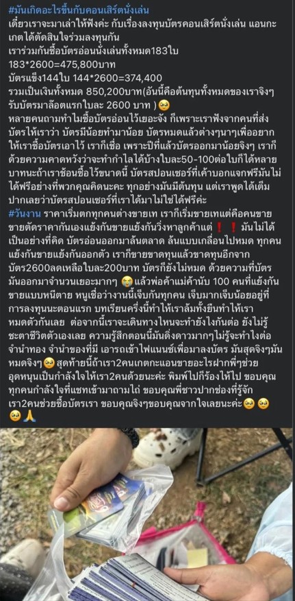 จากราคาต้นทุน 2,600 บาท ราคาหน้างานร่วงกราวรูดเหลือเพียงใบละ 200 บาท แต่ถึงกระนั้นก็ยังไม่สามารถระบายบัตรออกไปได้หมด ทำให้ผู้โพสต์ต้องแบกรับภาระขาดทุนอย่างหนัก