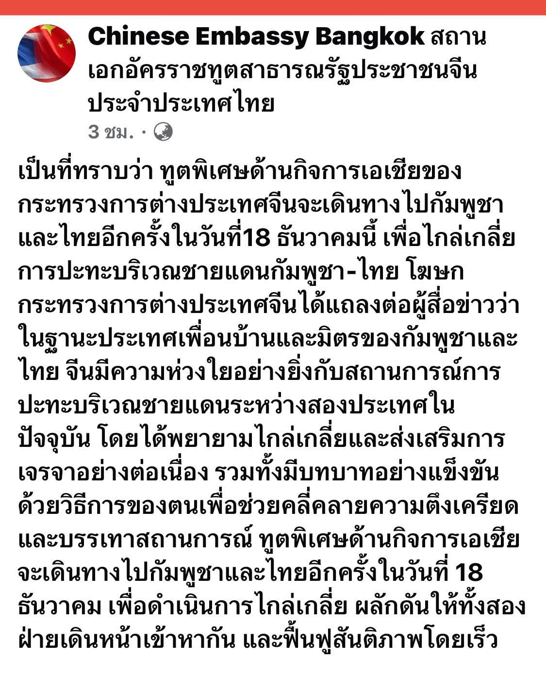 “เป็นที่ทราบว่า ทูตพิเศษด้านกิจการเอเชียของกระทรวงการต่างประเทศจีน จะเดินทางไปกัมพูชาและไทยอีกครั้ง ในวันที่ 18 ธันวาคมนี้ เพื่อไกล่เกลี่ยการปะทะบริเวณชายแดนกัมพูชา-ไทย