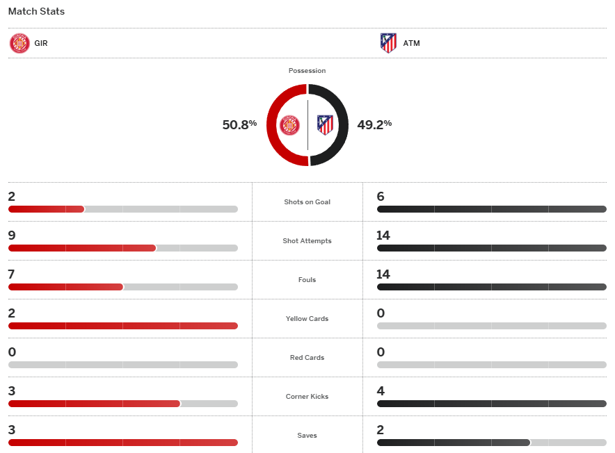 แอตเลติโก้ มาดริด ปิดเกมตั้งแต่ครึ่งแรกเมื่อได้ โกเก้ ตะบันไกลพาทีมออกนำก่อนจะเป็น คอนเนอร์ กัลลาเกอร์ ลงสำรองมายิงแฉลบเพิ่มไปอีกลูกตามด้วย อ็องตวน กรีซมันน์ ซัดปิดท้ายช่วงทดเจ็บ ตราหมี เอาชนะ กิโรน่า 3-0 ขยับขึ้นไปอยู่ในอันดับ 3 ชั่วคราว