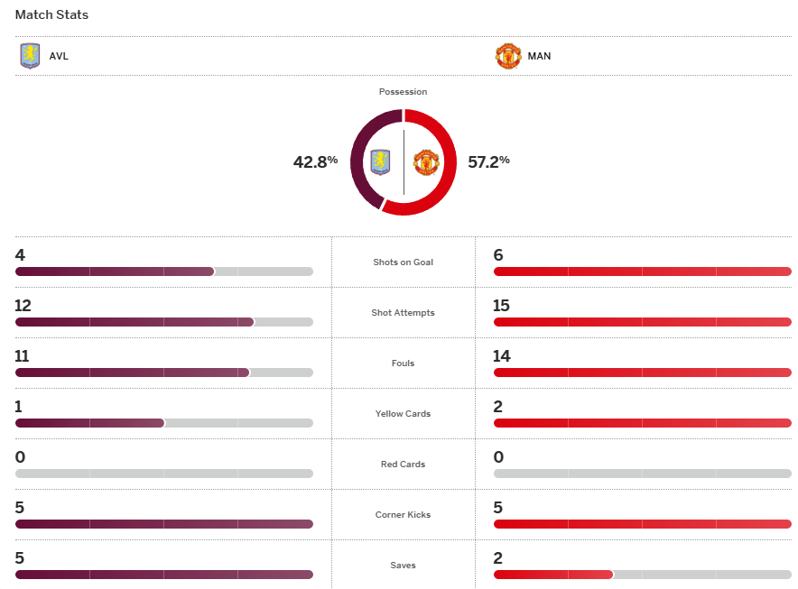 ท้ายเกมยูไนเต็ดพยายามบุกอย่างหนักแต่ทำอะไรไม่ได้ทำให้บุกมาแพ้ แอสตัน วิลล่า 2-1 ทีมของอูไน เอเมรี่ โชว์ฟอร์มสุดยอดชนะรวด 10 เกมรวมทุกรายการ