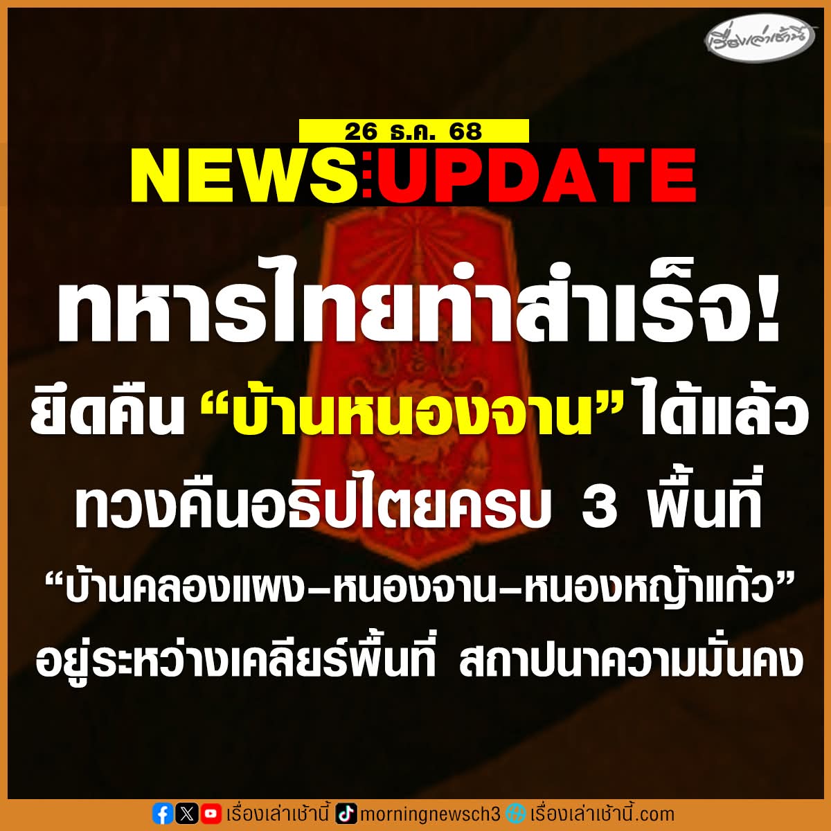 เมื่อเวลา 09.30 น. วันที่ 26 ธ.ค.2568 กองทัพภาคที่ 1 เปิดเผยว่า ในช่วงเช้าวันนี้ กำลังทหารฝ่ายไทยได้เข้าปฏิบัติการในพื้นที่บ้านหนองจาน อําเภอโคกสูง จังหวัดสระแก้ว โดยสามารถยึดพื้นที่ได้สำเร็จ