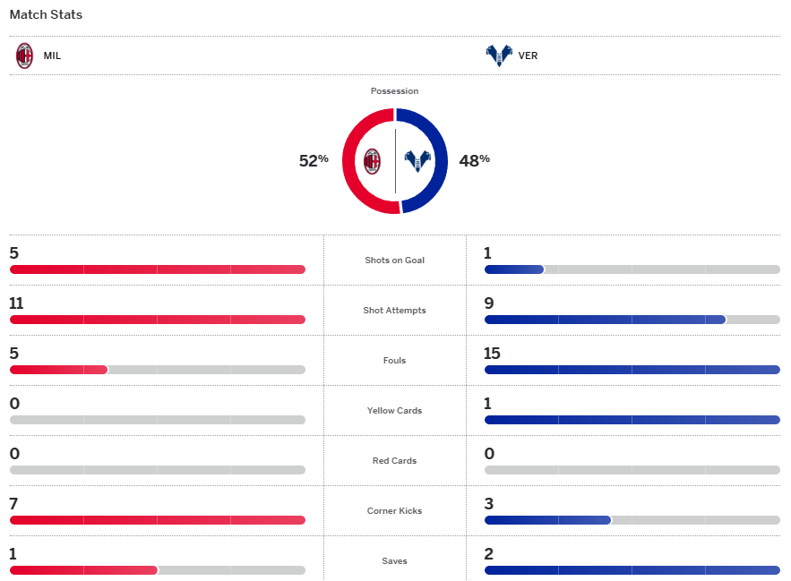 เอซี มิลาน ได้ คริสเตียน พูลิซิช ยิงประตูปลดล็อกในช่วงทดเจ็บครึ่งแรกก่อนที่ คริสโตเฟอร์ เอ็นคุนคู จะมาเบิ้ลเพิ่มจากจุดโทษและการยิงซ้ำจ่อๆ รอสโซเนรี่ เลยเอาชนะ เวโรน่า ไปอย่างไม่ยากเย็นนัก 3-0 ขึ้นไปเป็นจ่าฝูงชั่วคราว