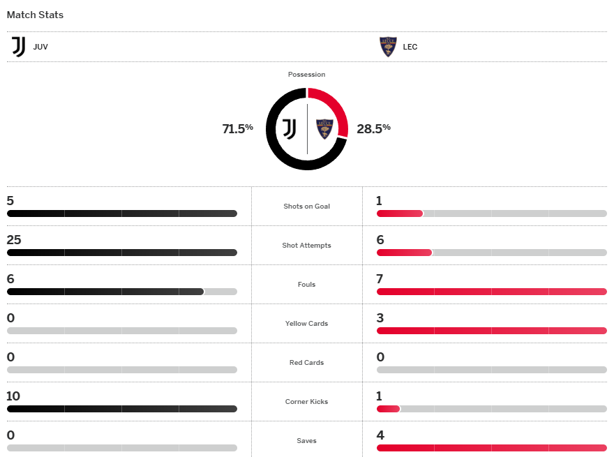 จบเกม ยูเวนตุส เสมอกับ เลชเช่ 1-1 ทำให้พวกเขาสะดุดหลังกวาดชัยชนะมา 3 เกมรวดก่อนหน้านี้และยังอยู่อันดับ 5 มีแต้มเท่า โรม่า แต่แข่งมากกว่า
