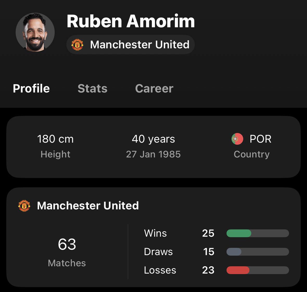 ถ้านับเฉพาะในพรีเมียร์ อโมริม เป็นผู้จัดการทีม แมนยู ที่เก็บชัยเป็นเปอร์เซ็นต์น้อยที่สุดในประวัติศาสตร์