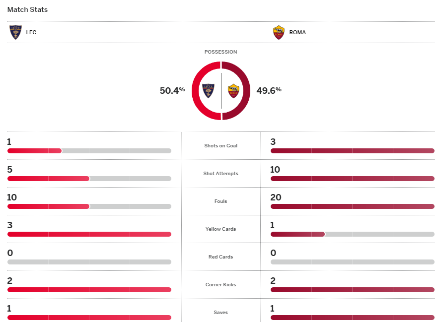 จบเกม โรม่า เอาชนะ เลชเช่ ไปได้ 2-0 เป็นการคว้าชัย 3 นัดจาก 5 เกมหลังสุดในลีกและทำให้พวกเขาขึ้นมาเป็นที่ 4 ชั่วคราวก่อนรอดูว่า ยูเวนตุส จะกลับมาเอาตำแหน่งได้หรือไม่