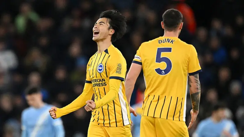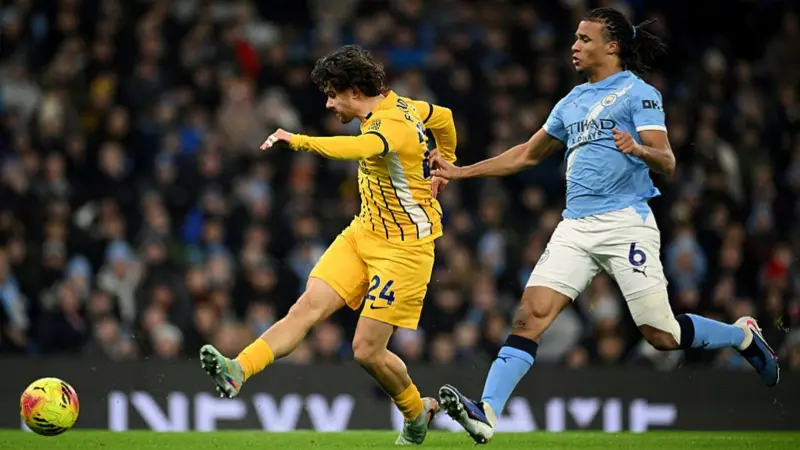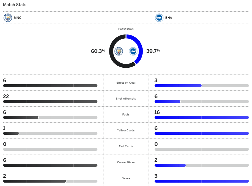 ไบรท์ตันเกือบได้ประตูนำแล้วจากจังหวะที่ซิตี้พลาดเอง นูเนสดักบอลโด่งพลาดมิโตมะหลุดลากเข้ากรอบเขตโทษก่อนไหลมาให้โกเมซจ่อๆ สามหลายิงผิดเหลี่ยมไปติดดอนนารุมม่าแล้วมิโตมะจะซ้ำไม่ได้