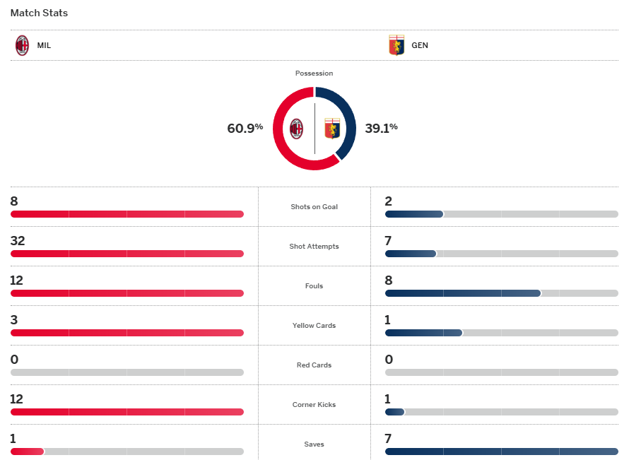 กลายเป็นเกมดราม่าไปเลยเมื่อ เอซี มิลาน โดนนำก่อนแล้วครึ่งหลังบุกต่อเนื่องจนได้ ราฟาเอล เลเอา โหม่งตีเสมอทดเจ็บนาที 90+2 แต่เกมมันไม่จบเพราะ เจนัว มาได้จุดโทษหลังจากนั้น แต่จนแล้วจนรอด นิโคเล สแตนซิอู ดันยิงพลาด รอสโซเนรี่ เลยรอดมาได้จบเกมเสมอ 1-1 แต่ก็ตามหลัง อินเตอร์ มิลาน จ่าฝูง 3 แต้ม