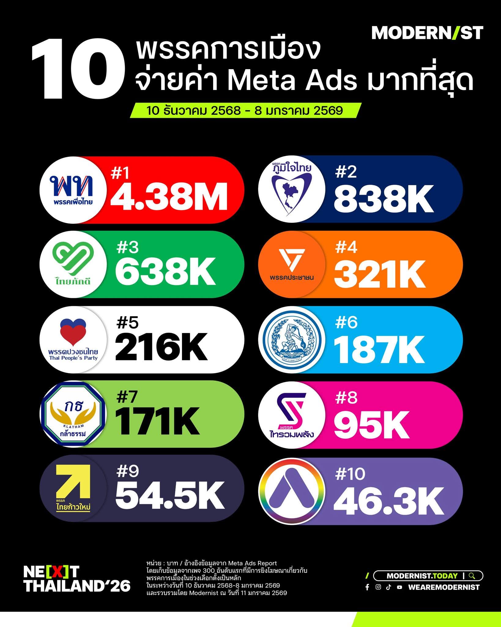 Modernist เราขอนำเสนอคอนเทนต์ที่ทุกคนน่าจะอยากรู้ คือ 10 อันดับพรรคการเมืองที่จ่ายเงินค่า Facebook Ads มากที่สุด ประจำวันที่ 10 ธันวาคม 2568 - 8 มกราคม 2569 โดยกองบรรณาธิการของเราใช้วิธีการรวบรวมสถิติ 300 อันดับแรกของ Facebook Ads หมวดหมู่การเมืองที่มีการใช้เงินโฆษณาสูงที่สุดในรอบ 30 วัน แล้วนำมาจัดลำดับ ตัดรายชื่อที่ไม่เกี่ยวข้องไป ทำให้ได้เพจจำนวนรวม 213 อันดับที่เป็นพรรคการเมือง หรือมีการโฆษณาพรรคการเมือง ซึ่งมีพรรคหลักๆ ที่ใช้เงินไปค่อนข้างเยอะพอสมควร ได้แก่…