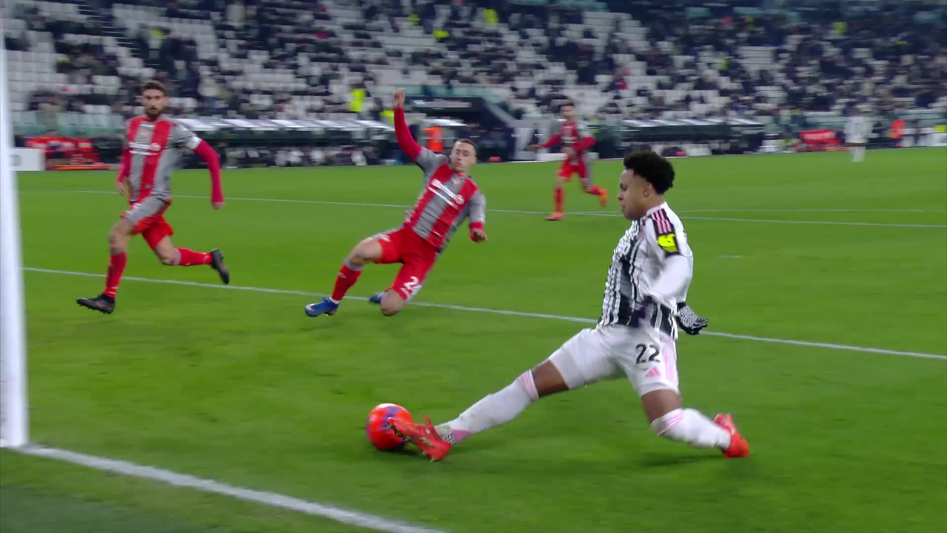 เกมรุกของ ยูเวนตุส มาเรื่อย ๆ เลย แล้วอีกอย่างเกมรับของ เครโมเนเซ่ ก็ยุ่ยด้วย ปล่อยให้ แม็คเคนนี่ ได้ยิงง่าย ๆ ยังดีที่เบาตรงตัว ออเดโร่