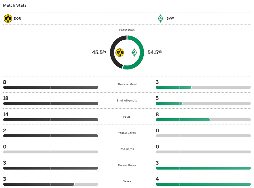โบรุสเซีย ดอร์ทมุนด์ ได้ประตูนำไวจาก นิโก้ ชล๊อตเตอร์เบ็ค แล้วก็เป็นฝ่ายทำได้ดีกว่าหาโอกาสได้เรื่อยๆก่อนจะบวกเพิ่มจาก มาร์เซล ซาบิทเซอร์ แล้วปิดท้ายด้วย เซห์รู กีราสซี่ ยิงได้สักทีหลังเป้าสะอาดมาตั้งแต่เดือนพฤศจิกายน เสือเหลือง เอาชนะ แวร์เดอร์ เบรเมน 3-0 ครองรองจ่าฝูงต่อไป