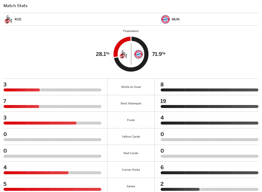 บาเยิร์น มิวนิค เป็นฝ่ายโดนนำไปก่อนหลัง โคโลญจน์ ใช้บอลโต้กลับสร้างอันตราย แต่ก็ยังคัมแบ็คกลับมาได้จาก แซร์จ กนาบรี้, คิม มิน แจ และปิดท้ายด้วย เลนนาร์ท คาร์ล ช่วยกันพา เสือใต้ แซงซิว แพะบ้า 3-1 กลับไปนำฝูง 11 แต้มตามเดิม