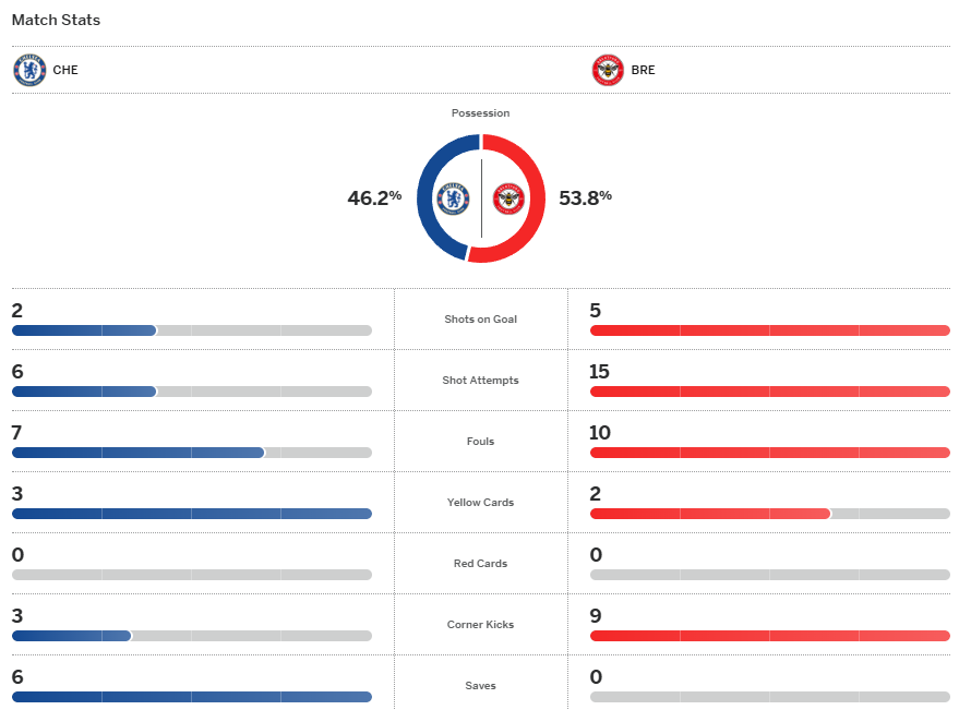 จบเกม เชลซี เอาชนะ เบรนท์ฟอร์ด ไปได้ 2-0 เป็นการเก็บชัยชนะนัดแรกในรอบ 6 นัดหลังสุดในลีกและขยับขึ้นไปอยู่ในอันดับ 6 ของตาราง