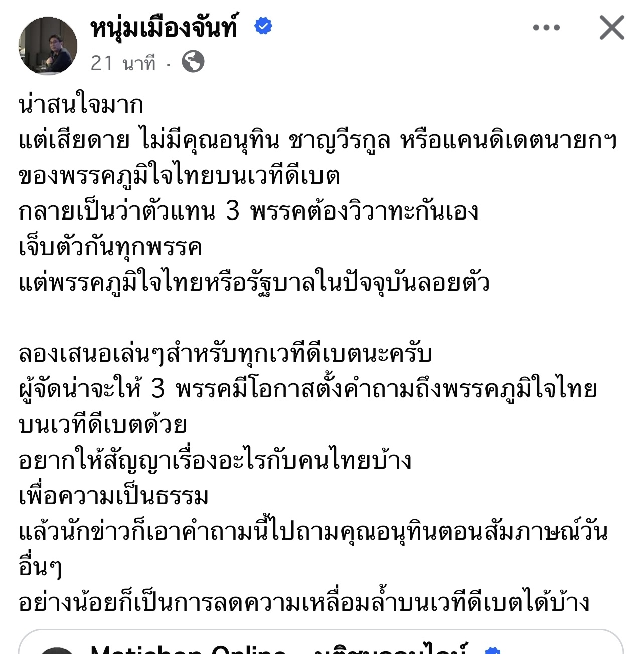 จริงๆคนจัดน่าจะยกปัญหาต่างๆที่เชื่อมโยงกับตัวมันหรือพรรคมัน มาให้คนที่มาดีเบตแสดงความเห็นด้วยถึงจะยุติธรรม