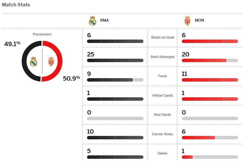 เรอัล มาดริด อัดอั้นมานาน ได้ทีรัวไม่ยั้งใส่ อาแอส โมนาโก 6-1 โดย คีลิยัน เอ็มบัปเป้ ยิงใส่ทีมเก่าถึงสองลูก ที่เหลือเป็น ฟรานโก้ มาสตันตูโอโน่, วินิซิอุส จูเนียร์, จู๊ด เบลลิงแฮม และการทำเข้าประตูตัวเองของ ธิโล เคห์เรอร์ จบเกมนี้พวกเขาขยับขึ้นไปรั้งรองจ่าฝูง ยูฟ่า แชมเปี้ยนส์ ลีก รอบลีกเฟส ตามหลัง อาร์เซน่อล 6 แต้ม