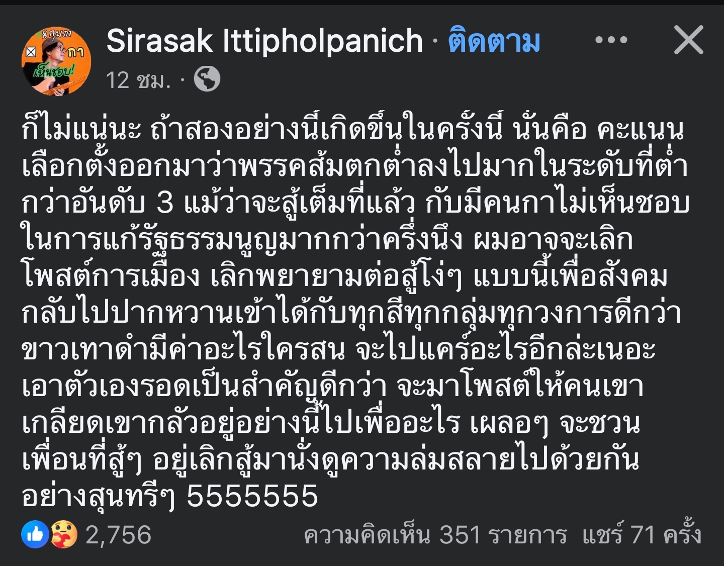 ถ้าส้มต่ำกว่าอันดับ 3 ตอนนั้นผมก็คงกลัวอย่างอื่นมากกว่าการเลือกตั้งหรือการเมืองแล้วครับ