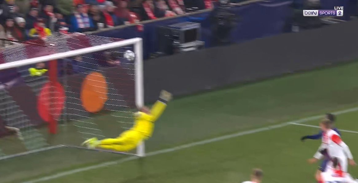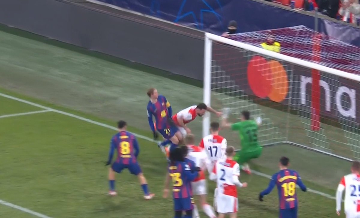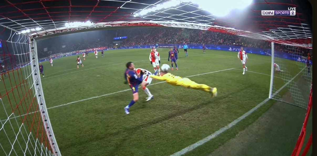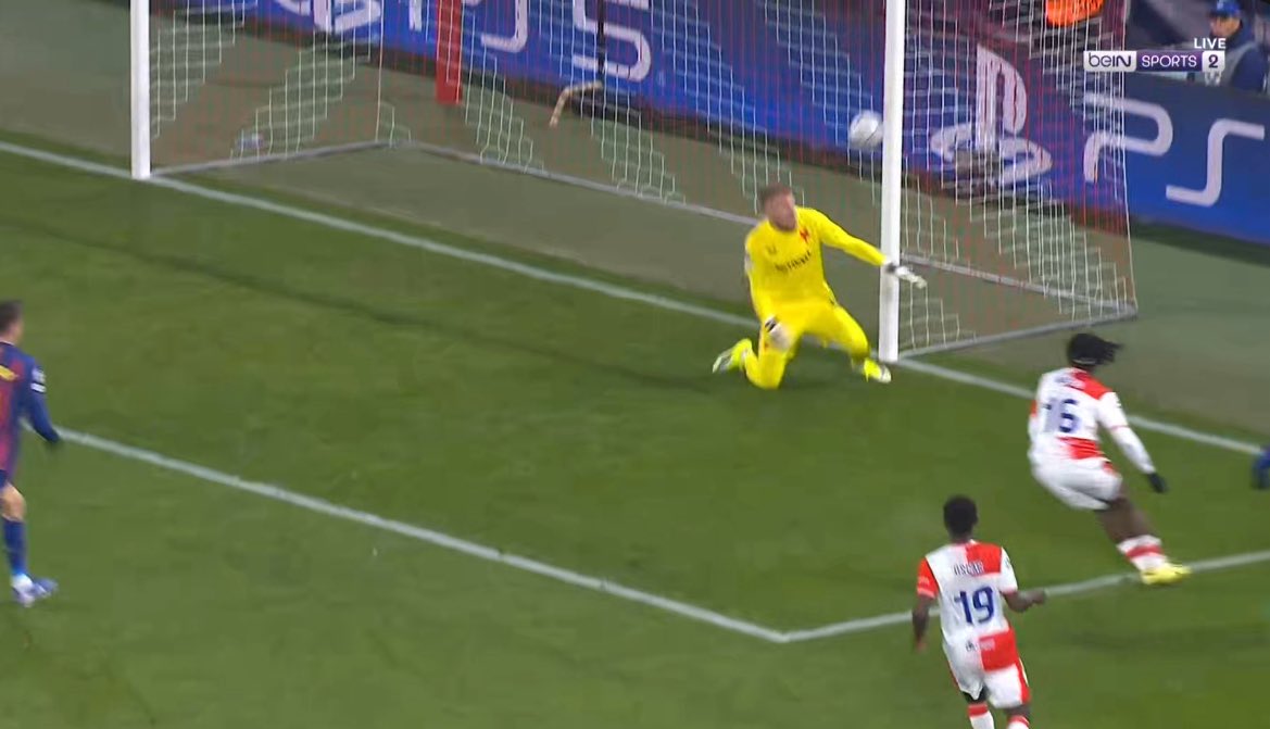 บาร์ซ่า เกือบได้ประตูตีเสมอ เอริค การ์เซีย รับบอลจาก คุนเด้ แล้วเลือกยิงไกลเองเลย น้ำหนักบอลดีมาก ๆ จะเสียบสามเหลี่ยมอยู่แล้ว แต่ สตาเน็ค ยังปัดทิ้งได้แบบหวุดหวิด