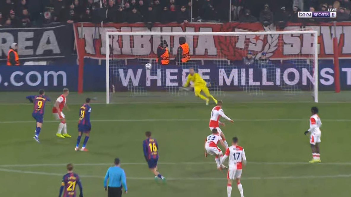 สลาเวีย ไปเล่นเกมรับจนโดน บาร์ซ่า แซงขึ้นนำ แต่ลูกเตะมุมทำงานอีกครั้ง ซาดิเล็ค เปิดไปเช็ดหัว ชาลูเป็ค บาง ๆ แล้วเด้งโดน เลวานดอฟสกี้ เข้าประตูตัวเอง