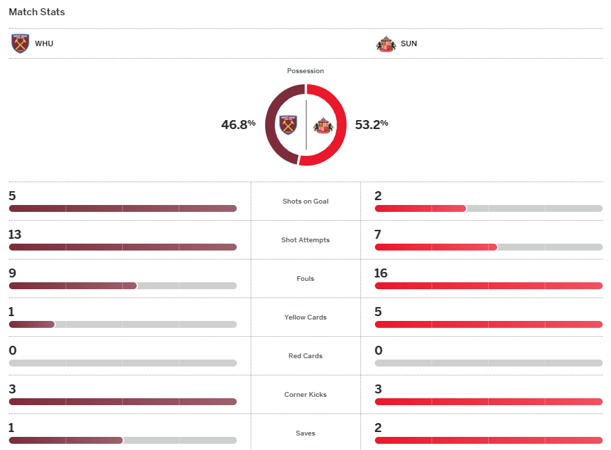 โหมดหนีตายของ เวสต์แฮม ยูไนเต็ด เริ่มจะทำงานแล้วหลังจากได้ จาร์ร็อด โบเว่น เปิดให้เพื่อนโหม่งประตูนำก่อนจะเป็นคนยิงจุดโทษเพิ่ม สมทบด้วยการยิงไกลอันยอดเยี่ยมของ มาเตอุส แฟร์นานเดส พา ขุนค้อน เอาชนะ ซันเดอร์แลนด์ 3-1 ขยับมาตามหลัง น็อตติ้งแฮม ฟอเรสต์ ในโซนปลอดภัยเหลือ 2 คะแนน