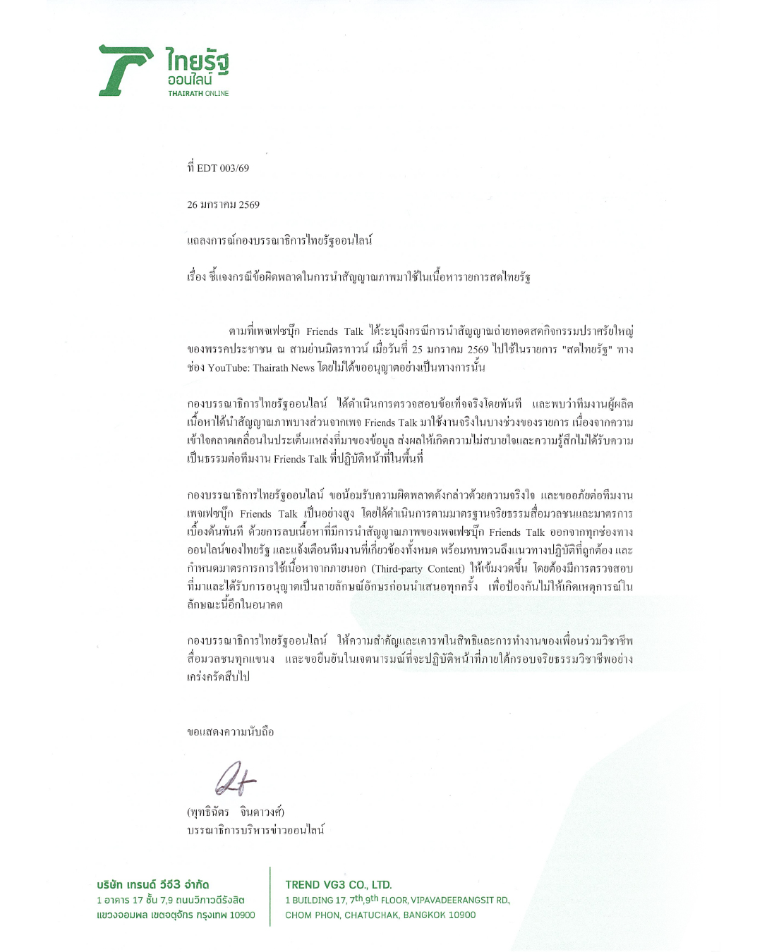 กองบรรณาธิการไทยรัฐออนไลน์ ขอน้อมรับความผิดพลาดดังกล่าวด้วยความจริงใจ และขออภัยต่อทีมงาน เพจเฟซบุ๊ก Friends Talk เป็นอย่างสูง โดยได้ดำเนินการตามมาตรฐานจริยธรรมสื่อมวลชนและมาตรการเบื้องต้นทันที ด้วยการลบเนื้อหาที่มีการนำสัญญาณภาพของเพจเฟซบุ๊ก Friends Talk ออกจากทุกช่องทางออนไลน์ของไทยรัฐ และแจ้งเตือนทีมงานที่เกี่ยวข้องทั้งหมด พร้อมทบทวนถึงแนวทางปฏิบัติที่ถูกต้อง และกำหนดมาตรการการใช้เนื้อหาจากภายนอก (Third-party Content) ให้เข้มงวดขึ้น โดยต้องมีการตรวจสอบที่มาและได้รับการอนุญาตเป็นลายลักษณ์อักษรก่อนนำเสนอทุกครั้ง เพื่อป้องกันไม่ให้เกิดเหตุการณ์ในลักษณะนี้อีกในอนาคต