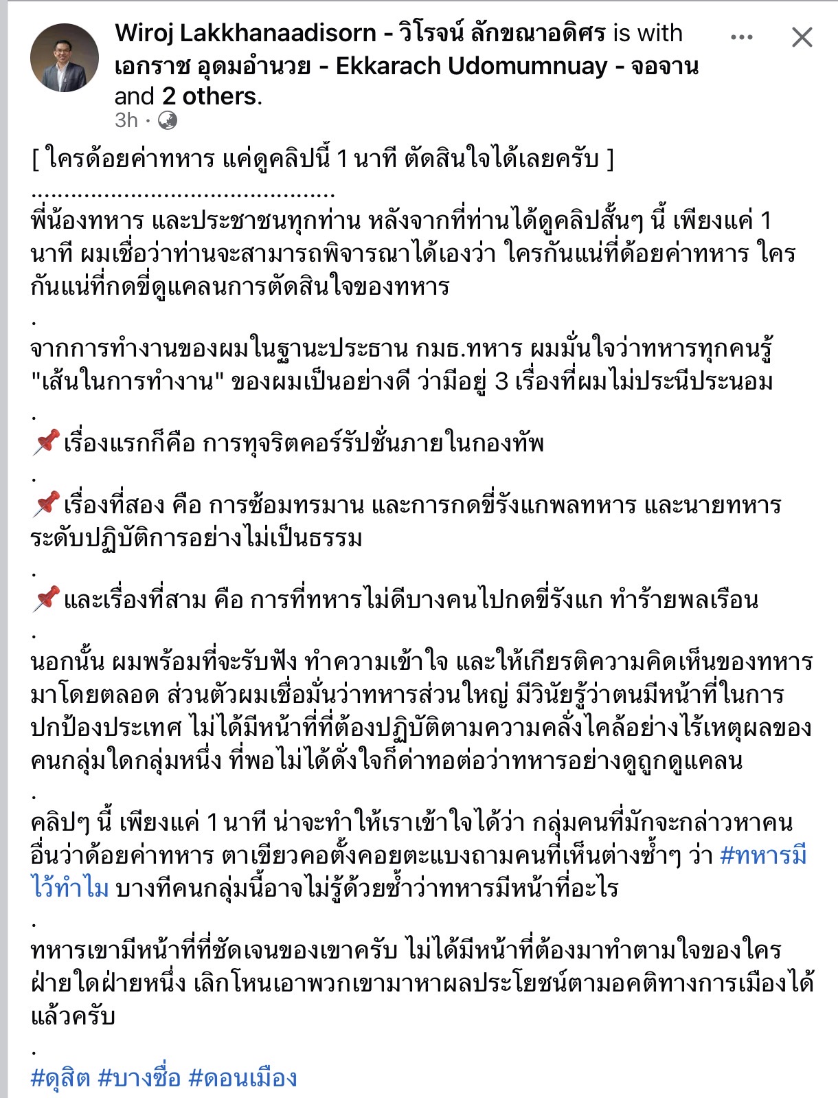 วิโรจน๋ 1 โพสต์ : "ใครด้อยค่าทหาร ดูแล้วตัดสินใจได้เลยครับ“