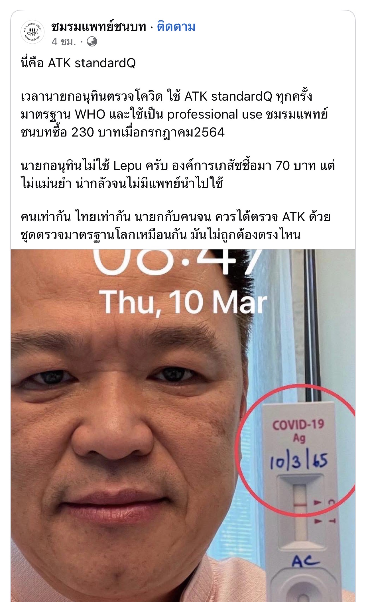 [RE: แพทย์ชนบทแชร์ นายก ยังใช้ ATK เกรดการแพทย์]