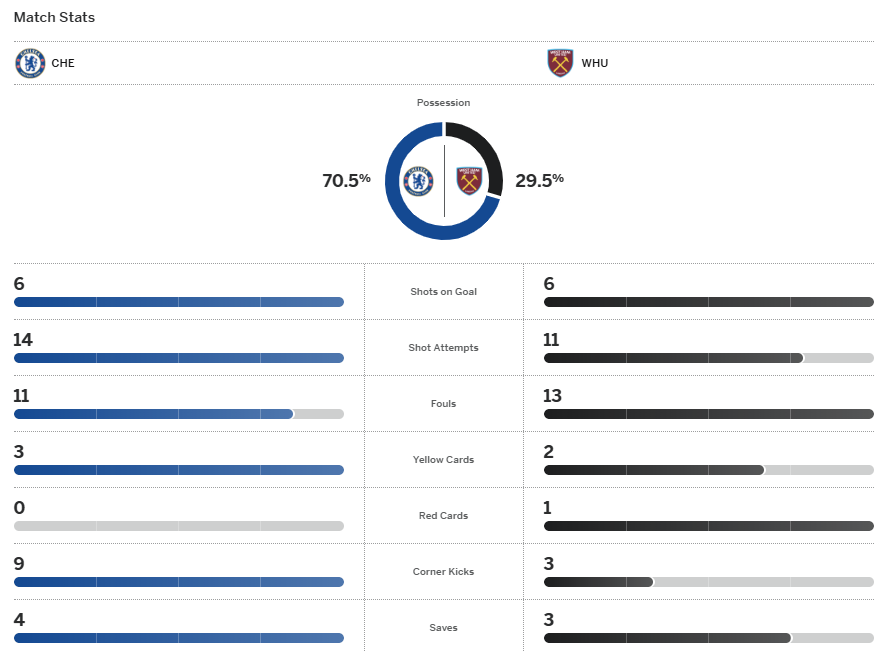 นึกว่าไม่รอดเสียแล้วเมื่อเวสต์แฮม บุกมานำ 2-0 ในครึ่งแรก ก่อนเลียม โรซีเนียร์ โชว์แก้เกมกลับมาครึ่งหลังได้สามประตูรวดจากตัวสำรองอย่างเชา เปโดร, มาร์ค คูคูเรญ่า และอ็นซ่ แฟร์นานเซ ทำให้เชลซี ไล่แซงชนะในท้ายที่สุด 3-2