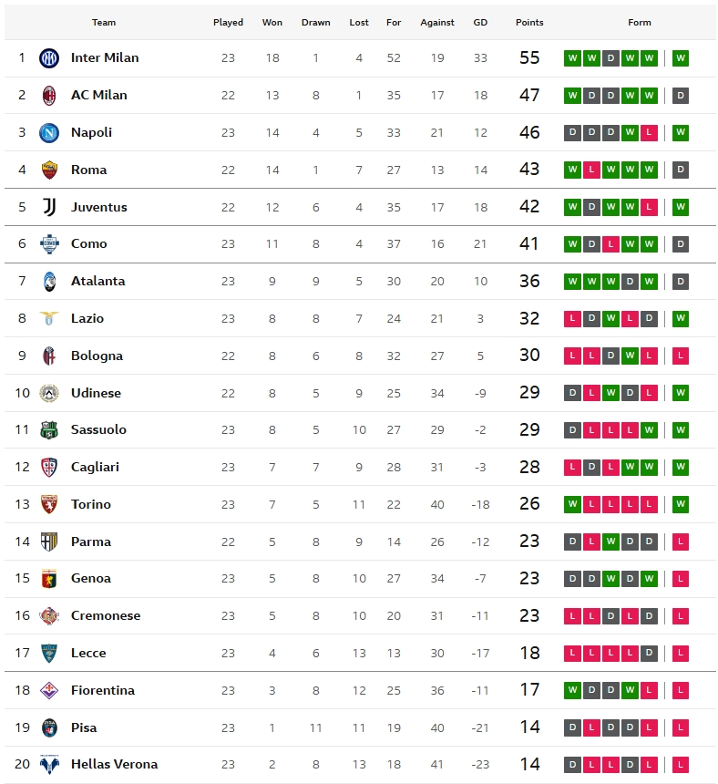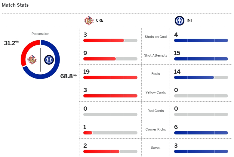อินเตอร์ มิลาน เดินหน้าคว้าชัยอย่างต่อเนื่อง ล่าสุดบุกเอาชนะ เครโมเนเซ่ แบบไม่ยากเย็นนัก 2-0 ได้ประตูจาก เลาตาโร่ มาร์ติเนซ และ ปิโอเตอร์ เซียลินสกี้ คนละตุง พร้อมทำสถิติไม่แพ้ใครในลีกเป็นเกมที่ 11 ติดต่อกัน (ชนะถึง 10) นำโด่งจ่าฝูง ทิ้งห่าง เอซี มิลาน 8 คะแนน