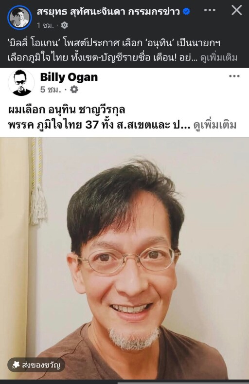 ‘บิลลี่ โอแกน’ โพสต์ประกาศ เลือก ‘อนุทิน’ เป็นนายกฯ เลือกภูมิใจไทย ทั้งเขต-บัญชีรายชื่อ เตือน! อย่าให้เสียงแตกเหมือนครั้งที่แล้ว