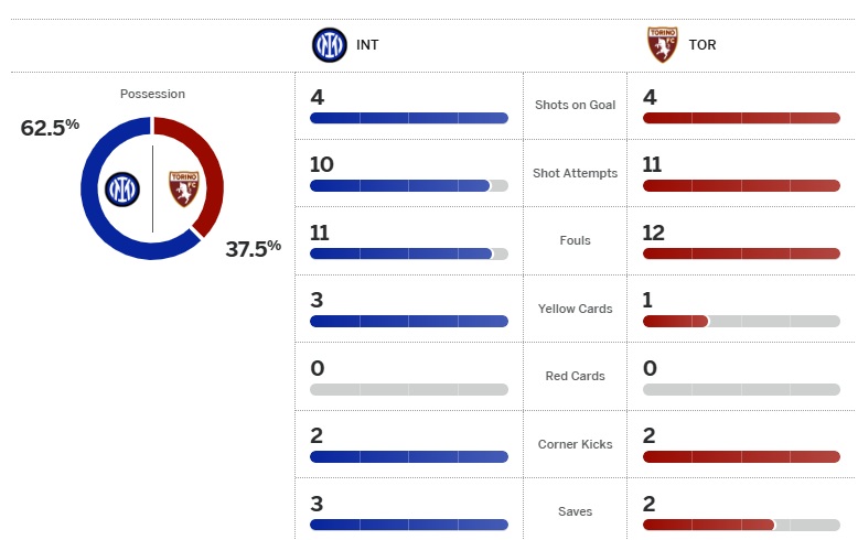 อินเตอร์ ครองบอลได้เยอะกว่า แต่เป็นโตริโน่ที่ได้ลุ้นก่อน จากจังหวะพาบอลไปลุ้นถึงพื้นที่สุดท้ายหน้าปากประตู แต่สุดท้ายไม่เด็ดขาด โดนกองหลังงูใหญ่สกัดทิ้งออกมาได้หวุดหวิด