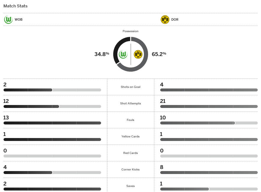 จบเกม ดอร์ทมุนด์ ทำได้เฉือนชนะ โวลฟ์สบวร์ก 2-1 คว้าชัย 5 เกมรวดและขยับไปตามหลัง บาเยิร์น เหลือ 3 คะแนนแล้ว