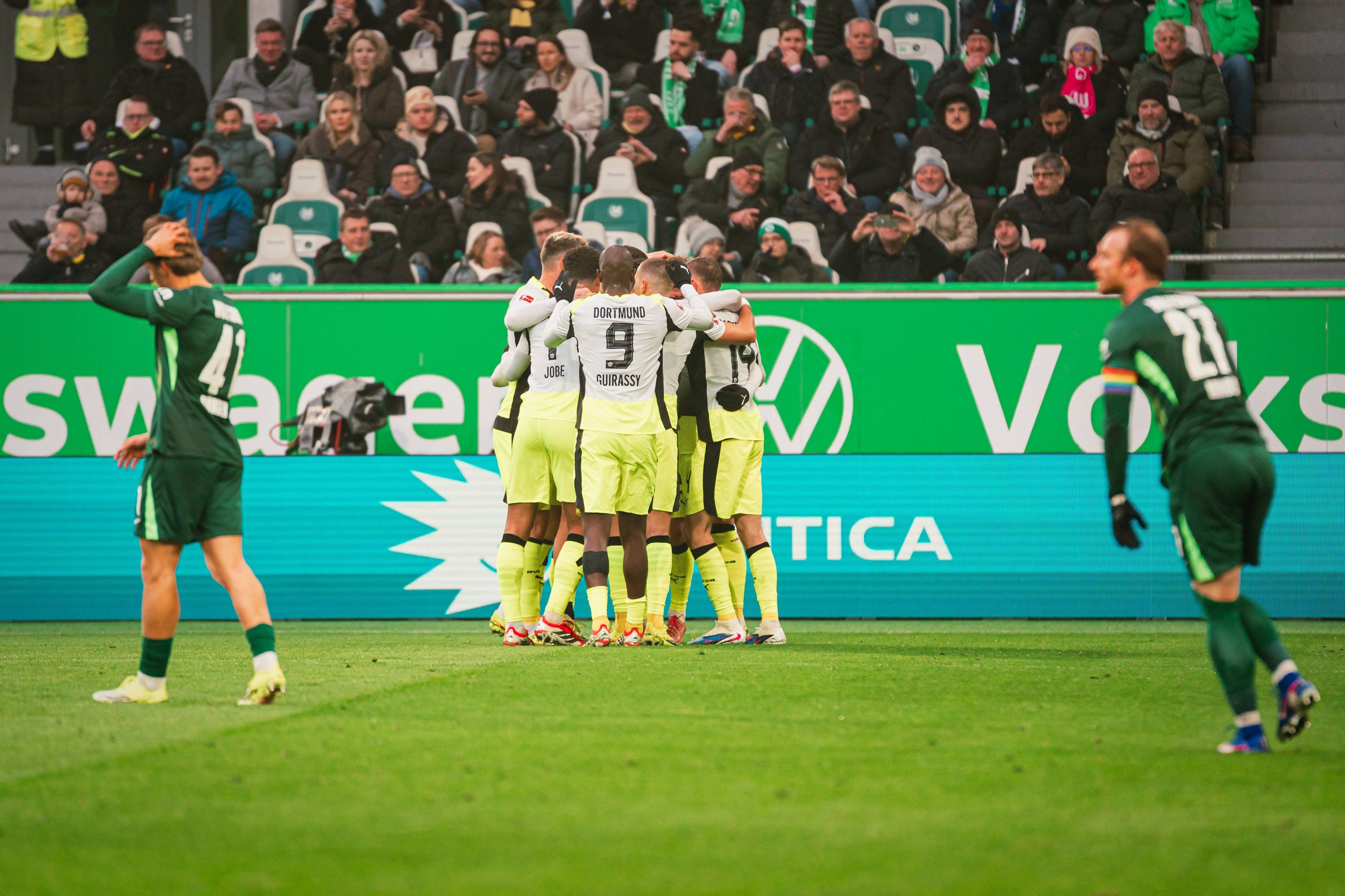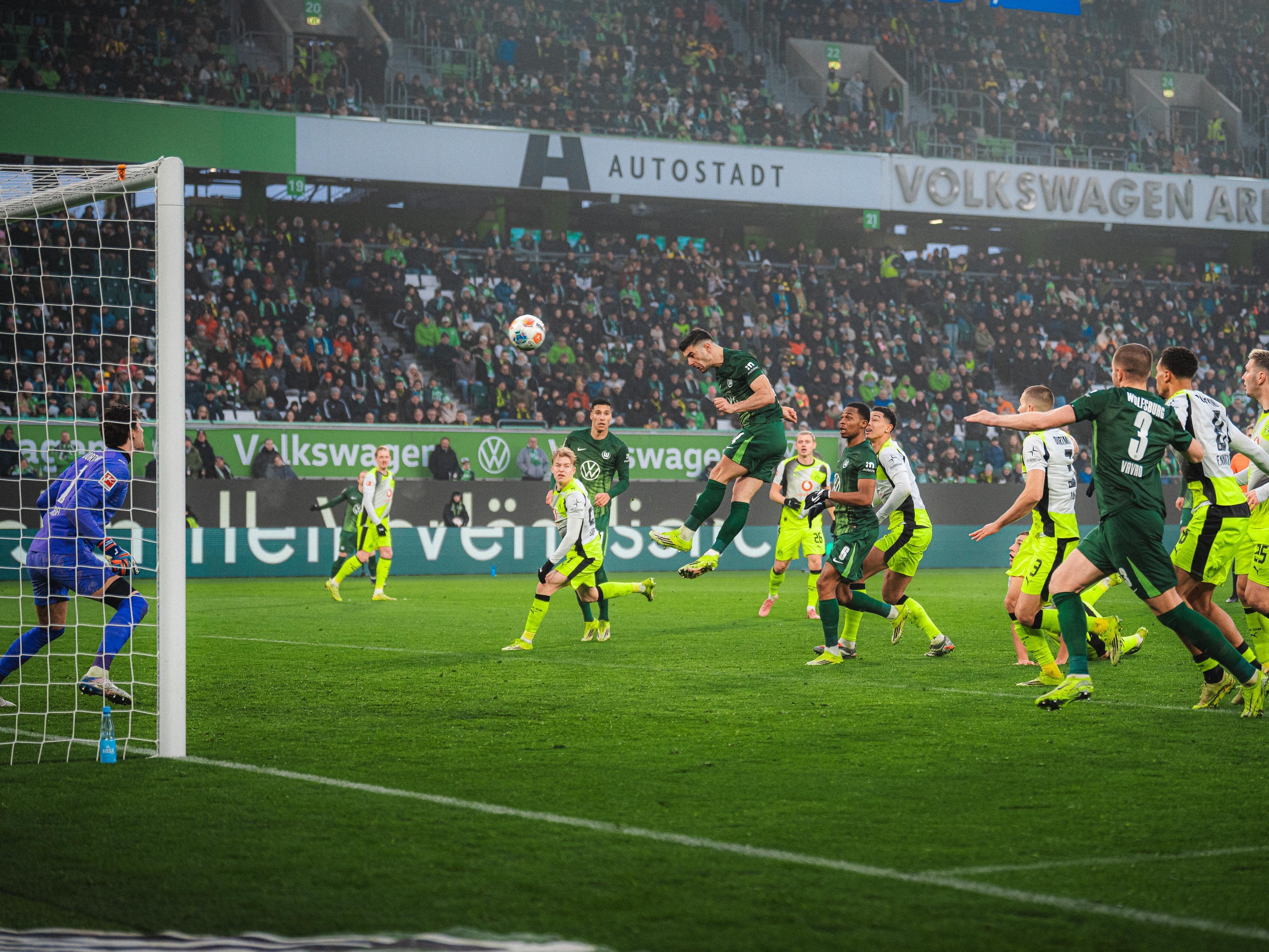 โบรุสเซีย ดอร์ทมุนด์ เกือบไปแล้วเป็นฝ่ายนำก่อนจากลูกโหม่งของ ยูเลี่ยน บรันท์ แต่เข้าครึ่งหลังแทบแย่โดนตีเสมอได้แถมเกือบโดนแซงอีกหลายหนแต่ โวลฟ์สบวร์ก ไม่คมกันเองสุดท้าย เซห์รู กีราสซี่ กลายเป็นฮีโร่ยิงนาที 87 ช่วย เสือเหลือง เฉือนชนะ 2-1 เก็บแต้มไล่ บาเยิร์น มิวนิค เหลือ 3 คะแนน