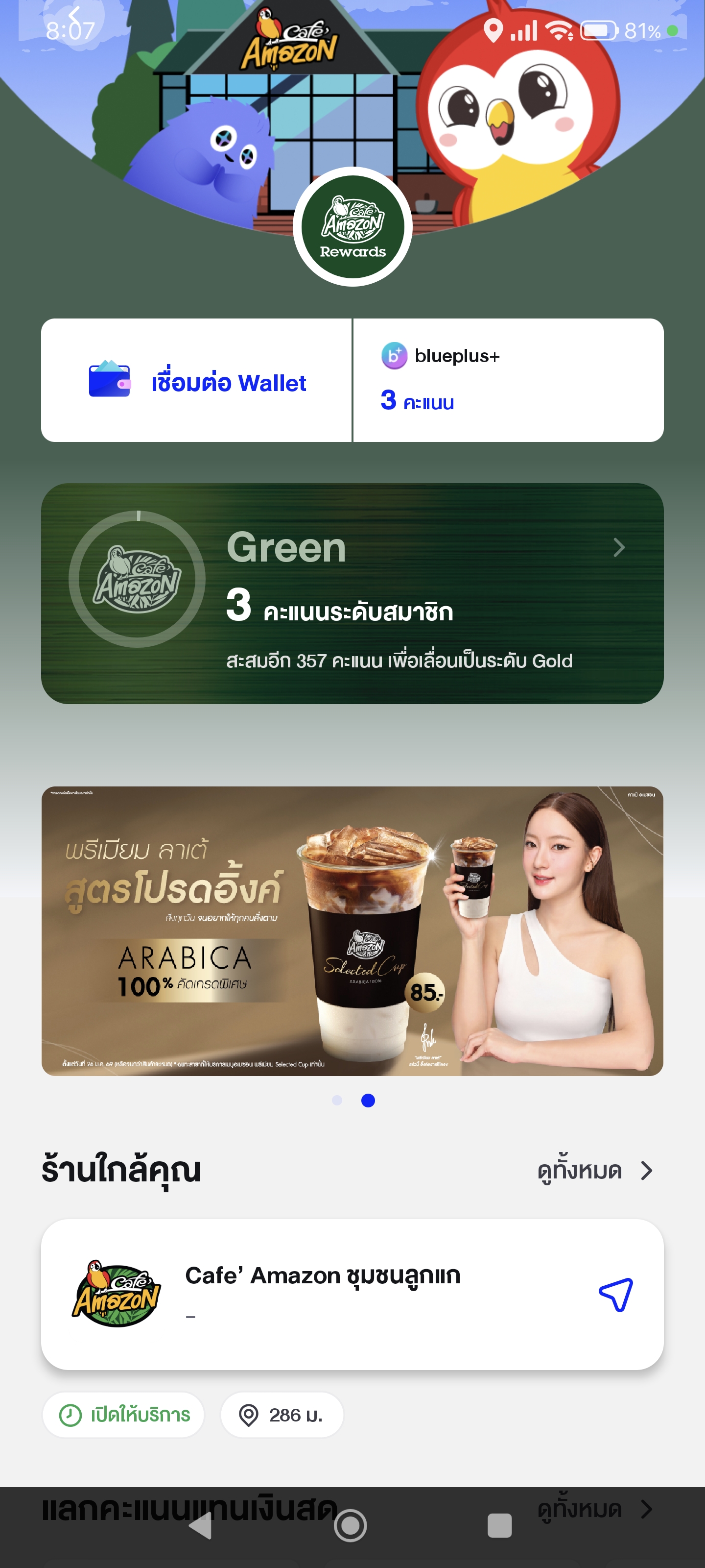 หลังจากเลือกตั้งเสร็จแล้ว ก็ไปกินข้าวเช้าของผมและกาแฟร้านอเมซอนกันครับ ตอนนี้ผมสมัครบลูการ์ดแล้วด้วยครับ สั่งลาเต้เย็นไปครับ แล้วก็ไปสั่งก๋วยเตี๋ยวร้านเจ๊เอ๋ครับ