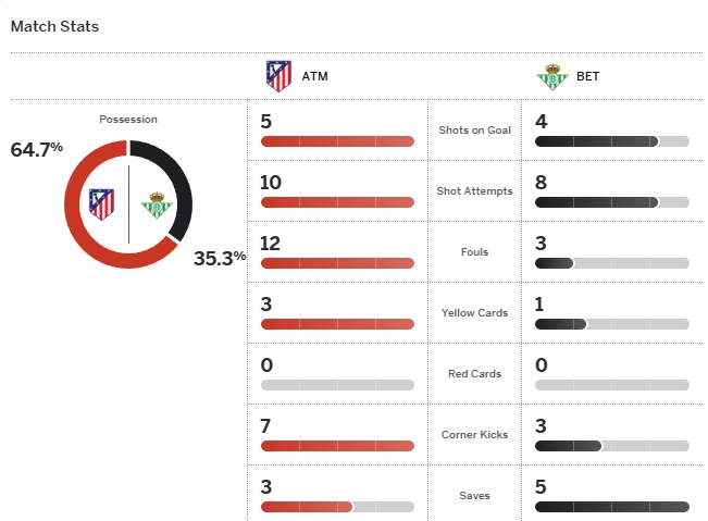 ตราหมี แอตเลติโก้ มาดริด ต้องพบกับความปราชัยนัดแรกในบ้านแล้ว เมื่อพ่ายแพ้ให้กับเรอัล เบติส 1-0 ในเกมที่พวกเขาตีเสมอได้แล้ว (น.74) จากการเข้าประตูตัวเองของ ดิเอโก้ ญอเรนเต้ แต่ VAR ขีดเส้นให้พวกเขาล้ำหน้าแบบปลายเล็บ ขณะที่เบติส ถือเป็นการบุกมาล้างอายจากที่เพิ่งพ่ายแพ้คาบ้านให้ทีมตราหมีถึง 5-0 ในโคปา เดล เรย์
