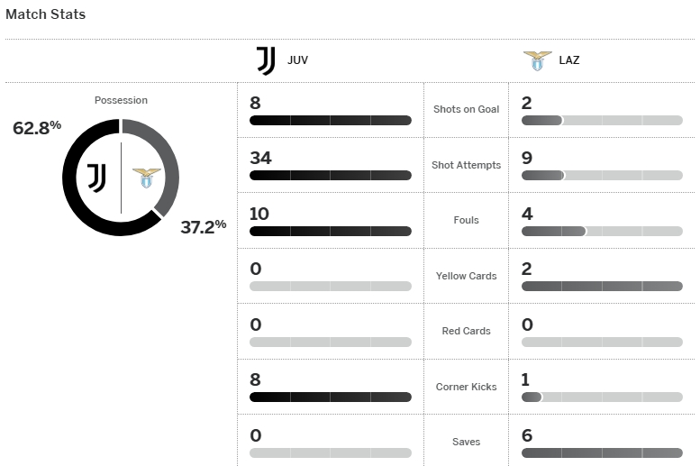 ยูเวนตุส บุกเยอะมาก ๆ แต่ไม่คมกันเอง บวกกับเจอความเหนียวของ อิวาน โปรเวเดล ที่เซฟหลายครั้ง ก่อนโดนทีเด็ดเกมสวนกลับของ ลาซิโอ ยิงนำสองประตูจาก เปโดร และ กุสตาฟ อิซัคเซ่น แต่ทว่าพวกเขาฮึดยิงสองลูกคืนจาก เวสตัน แม็คเคนนี่ และ ปิแอร์ คาลูลู ที่โหม่งนาทีบาป จบเกมเสมอกันไป 2-2