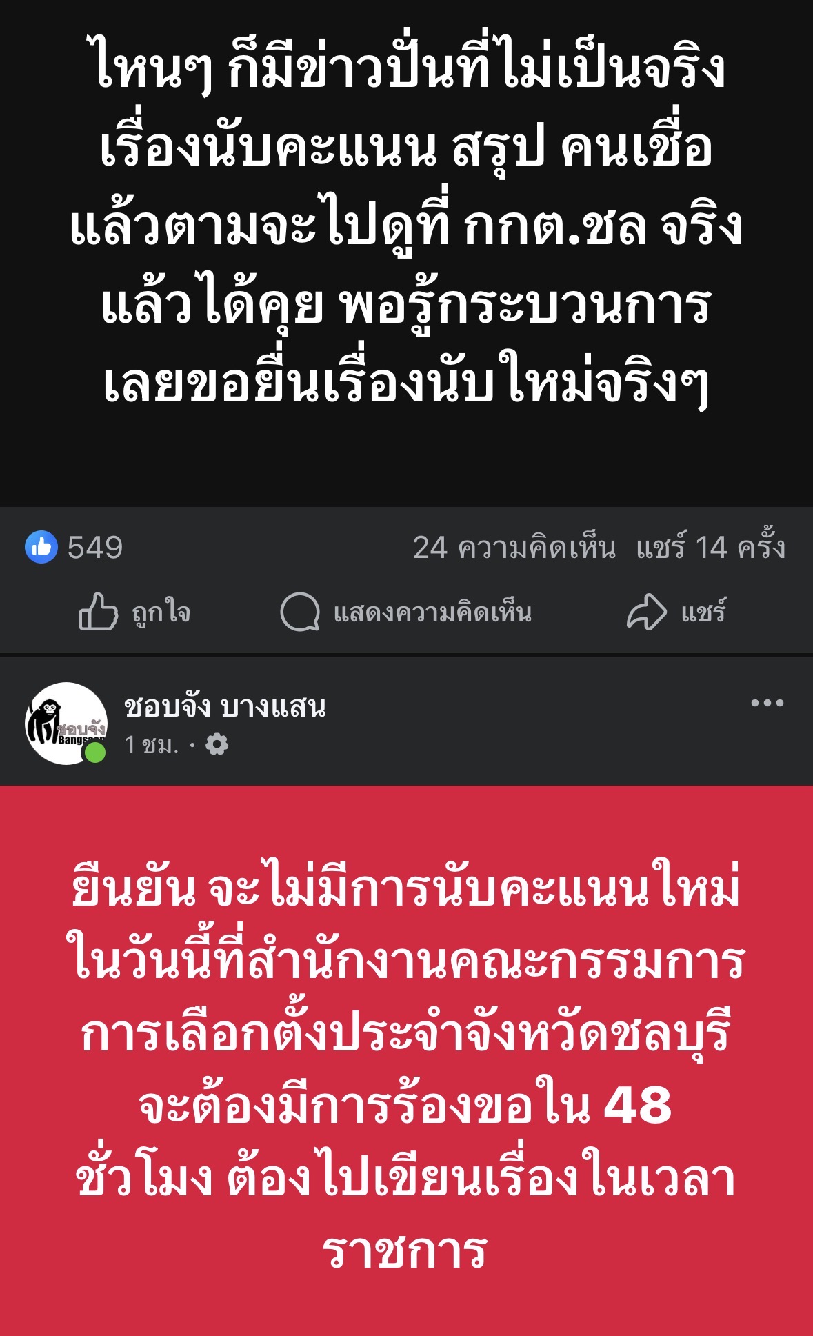 [fake news] ชลบุรี เขต 1 นับคะแนนใหม่ 18.00