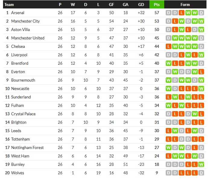 ปืนใหญ่ อาร์เซนอล เสีย 2 คะแนนสำคัญในการไล่ล่าแชมป์พรีเมียร์ลีก เมื่อพวกเขาบุกไปทำได้แค่เสมอเบรนท์ฟอร์ด 1-1 ในเกมที่ทัพปืนใหญ่ขึ้นนำก่อนจาก โนนี่ มาดูเอเก้ (น.61) ก่อนโดน คีน ลูอิส-พอตเตอร์ ตีเสมอนาที 71 ทำให้จบนัดที่ 26 พวกเขามีแต้มนำแมนเชสเตอร์ ซิตี้ เหลือแค่ 4 คะแนนเท่านั้น