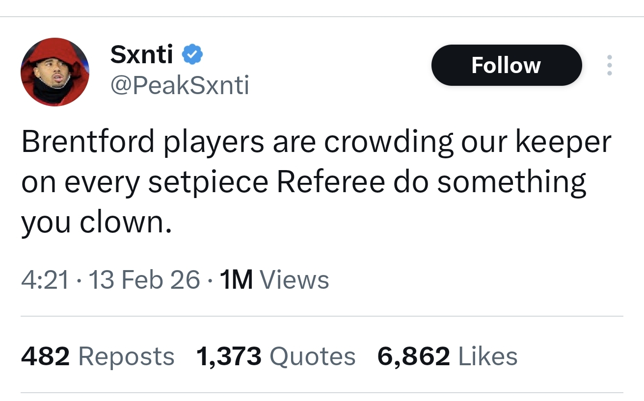 "พวกนักเตะเบรนท์ฟอร์ดรุมล้อมผู้รักษาประตูเราทุกจังหวะลูกตั้งเตะเลย กรรมการทำอะไรสักอย่างสิโว้ย ไอ้ตัวตลก!"