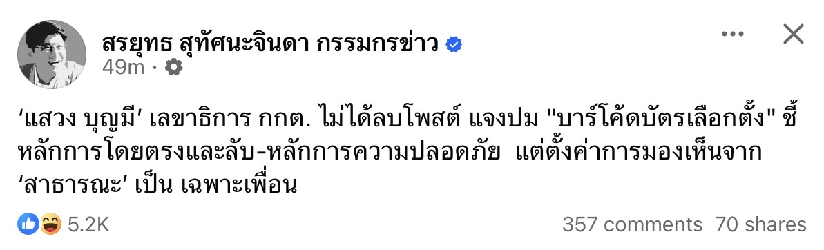 [RE: แสวง แจงไม่ได้ลบโพสต์ แค่ตั้งค่าการมองเห็นเป็น “เฉพาะเพื่อน”]