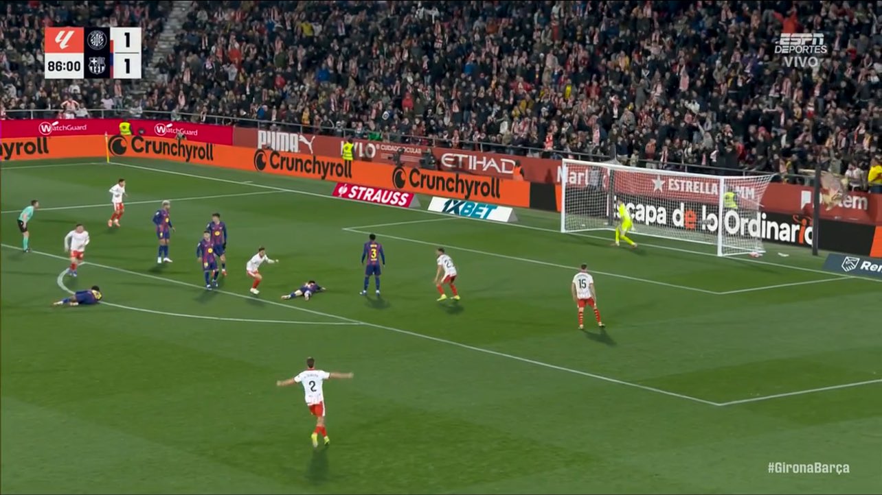 จิโรน่า ได้ฟรีคิกระยะหวังผล หลัง เอริค การ์เซีย ไปทำฟาวล์ เฮส จังหวะสวนกลับ แล้วก็เป็น ซีกานคอฟ ที่ซัดเหินข้ามคานนิดเดียว
