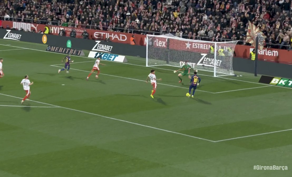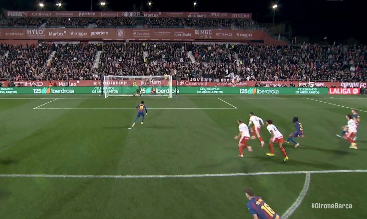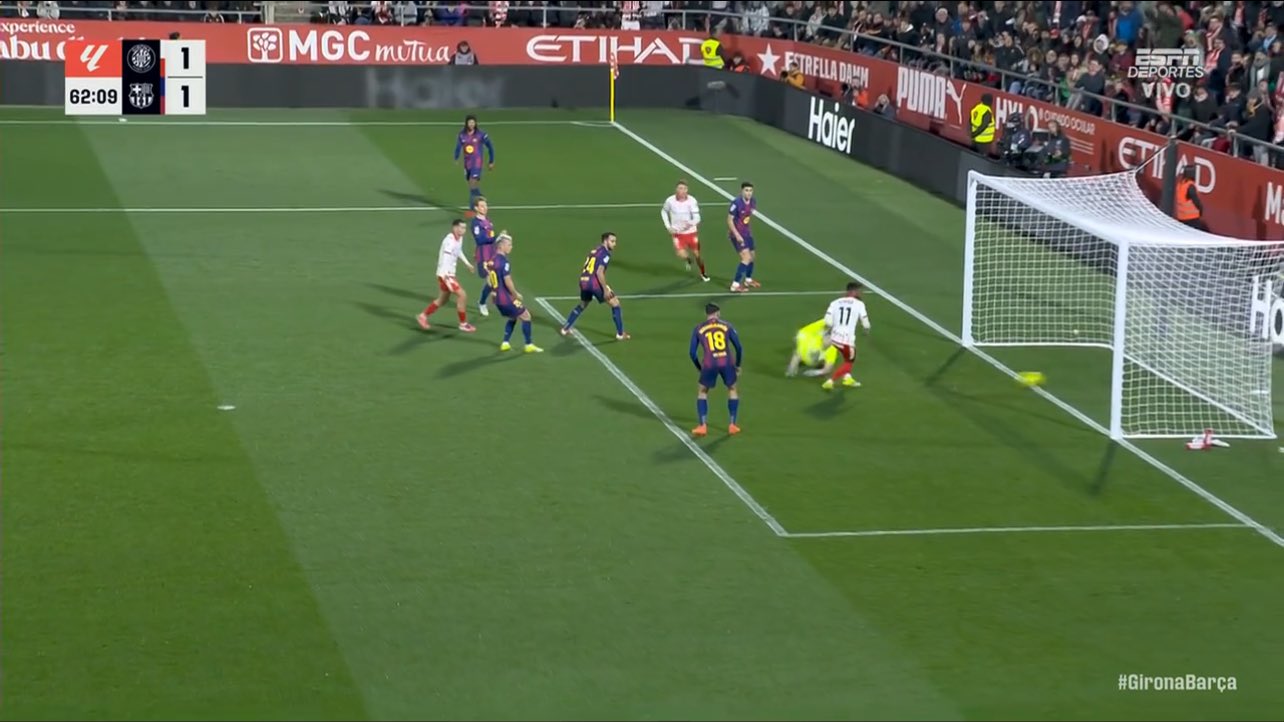 จิโรน่า ทีเด็ดเลย พลิกขึ้นนำเฉย เอเชเบร์รี่ ปั๊มบอลจาก คุนเด้ จากนั้นจ่ายให้ โรก้า แล้วไหลต่อไปที่ เบลตราน ซัดหักข้อเสาแรกเข้าไป การ์เซีย ได้แค่มองเท่านั้น