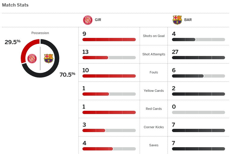 บาร์เซโลน่า โอกาสอย่างเยอะแต่เกมรุกไม่เฉียบขาดเอง ลามีน ยามาล มีโอกาสใส่สกอร์แต่ดันพลาดจุดโทษช่วงทดเจ็บครึ่งแรก แม้ว่า เปา กูบาร์ซี่ โหม่งขึ้นนำนาทีที่ 59 แต่จากนั้นไม่นาน โธมัส เลอมาร์ ก็ซัดตีเสมอให้ จิโรน่า แบบทันควันนาที 62 แล้วก็เป็น ฟราน เบลตราน ตัวสำรองซัดประตูชัยนาที 86 พลิกแซงชนะ 2-1 นั่นทำให้สัปดาห์นี้ลูกทีมของ ฮันซี่ ฟลิค หล่นไปรองจ่าฝูงถาวร