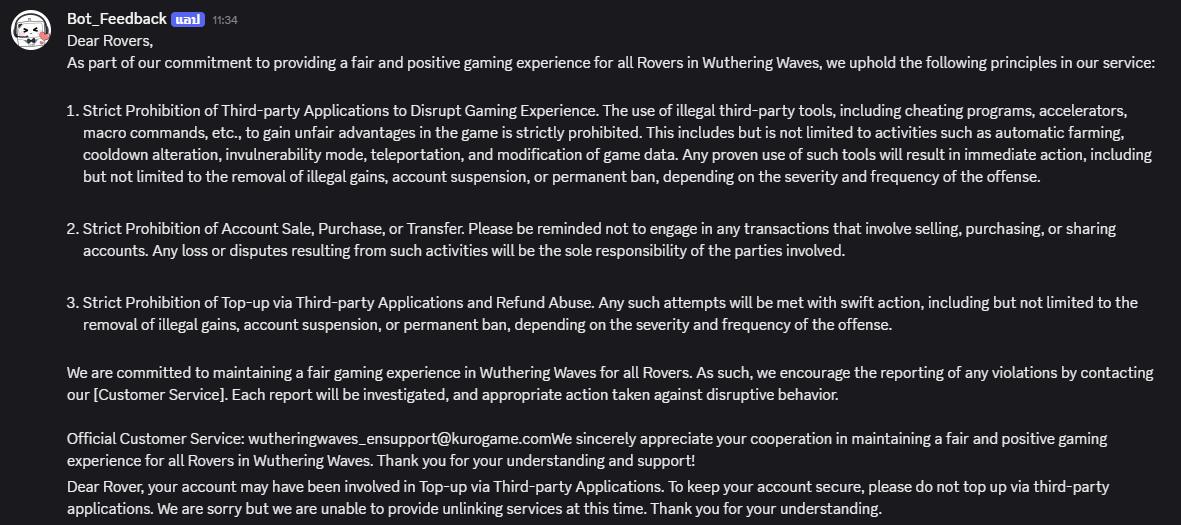 เรามุ่งมั่นที่จะรักษาประสบการณ์การเล่นเกมที่ยุติธรรมใน Wuthering Waves สำหรับผู้เล่นทุกคน ดังนั้น เราขอแนะนำให้รายงานการละเมิดใดๆ โดยติดต่อ [ฝ่ายบริการลูกค้า] ของเรา รายงานทุกฉบับจะได้รับการตรวจสอบ และจะมีการดำเนินการที่เหมาะสมกับพฤติกรรมที่ก่อกวน