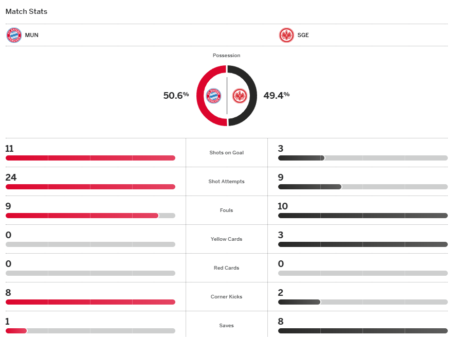 จบเกม บาเยิร์น ยังเอาชนะ แฟรงเฟิร์ต ไปได้ 3-2 ทำให้เก็บชัยชนะ 3 นัดติดต่อกันในลีกและขยับขึ้นไปนำฝูงที่ 9 คะแนนเป็นการชั่วคราว