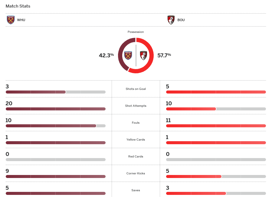 ทั้งสองทีมมีโอกาสพังประตูกันทั้งสองฝ่ายโดยเฉพาะเวสต์แฮม ยูไนเต็ด ที่ได้ลุ้นหลายหนแต่ก็คมไม่พอที่จะเจาะตาข่ายก่อนจบเกมเสมอบอร์นมัธ 0-0 แบ่งไปทีมละแต้ม