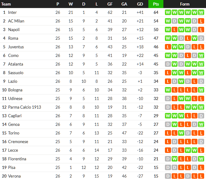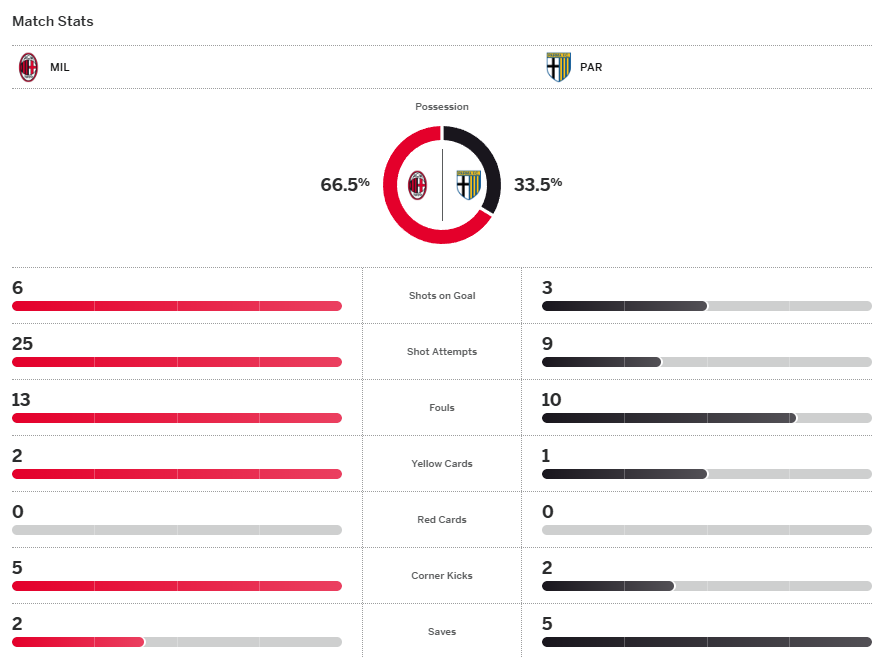 จบเกม มิลาน ต้องพบกับความพ่ายแพ้ต่อ ปาร์ม่า 1-0 ทำให้พวกเขาไร้ชัยชนะตลอด 2 เกมหลังสุดและแบบนี้ทำให้พวกเขาหล่นมาตามหลัง อินเตอร์ ไกลถึง 10 คะแนนแล้ว