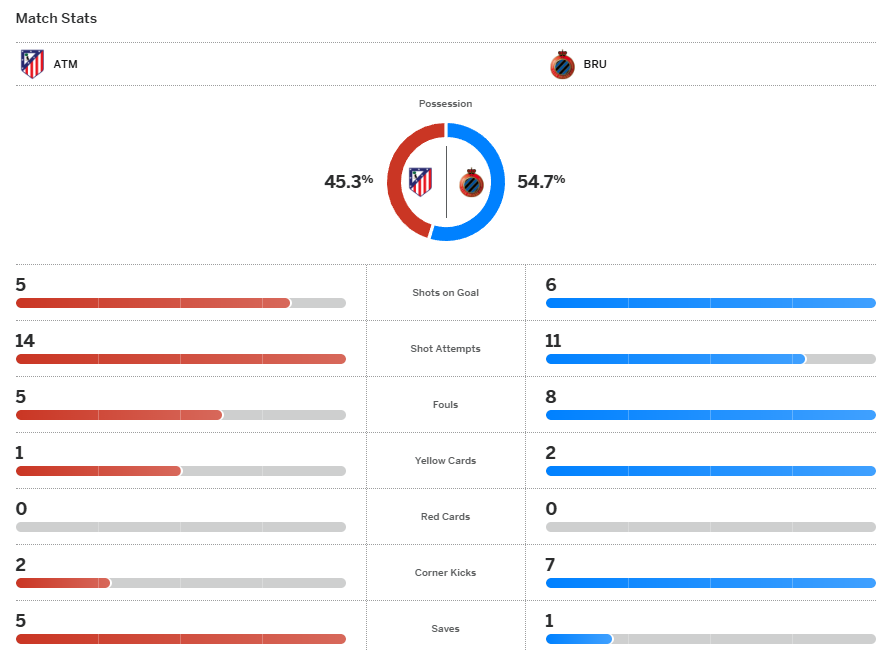 จบเกม แอตฯ มาดริด เอาชนะ คลับ บรูกก์ 4-1 รวมผลสองนัดเข้ารอบด้วยสกอร์ 6-4 ไปรอฟังผลจับสลากว่าจะได้พบกับ สเปอร์ส หรือ ลิเวอร์พูล ในรอบ 16 ทีมสุดท้าย