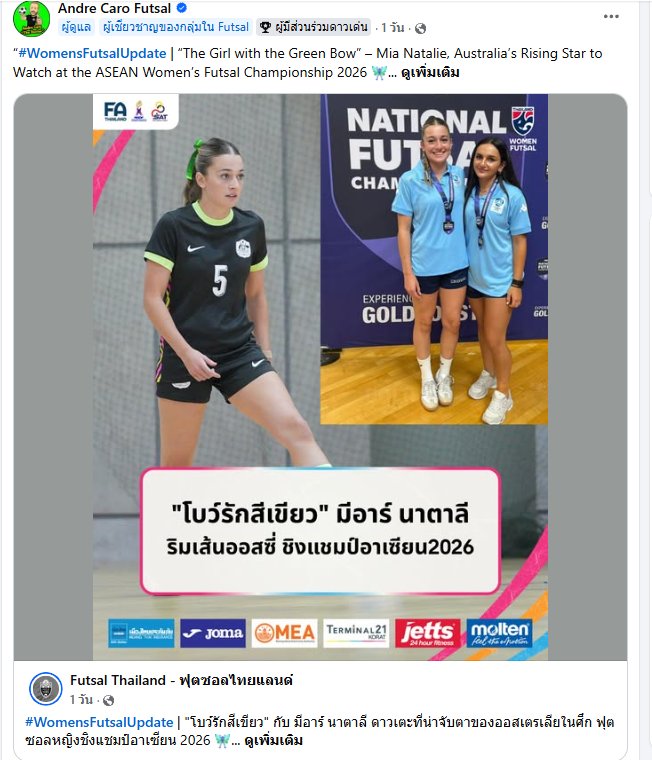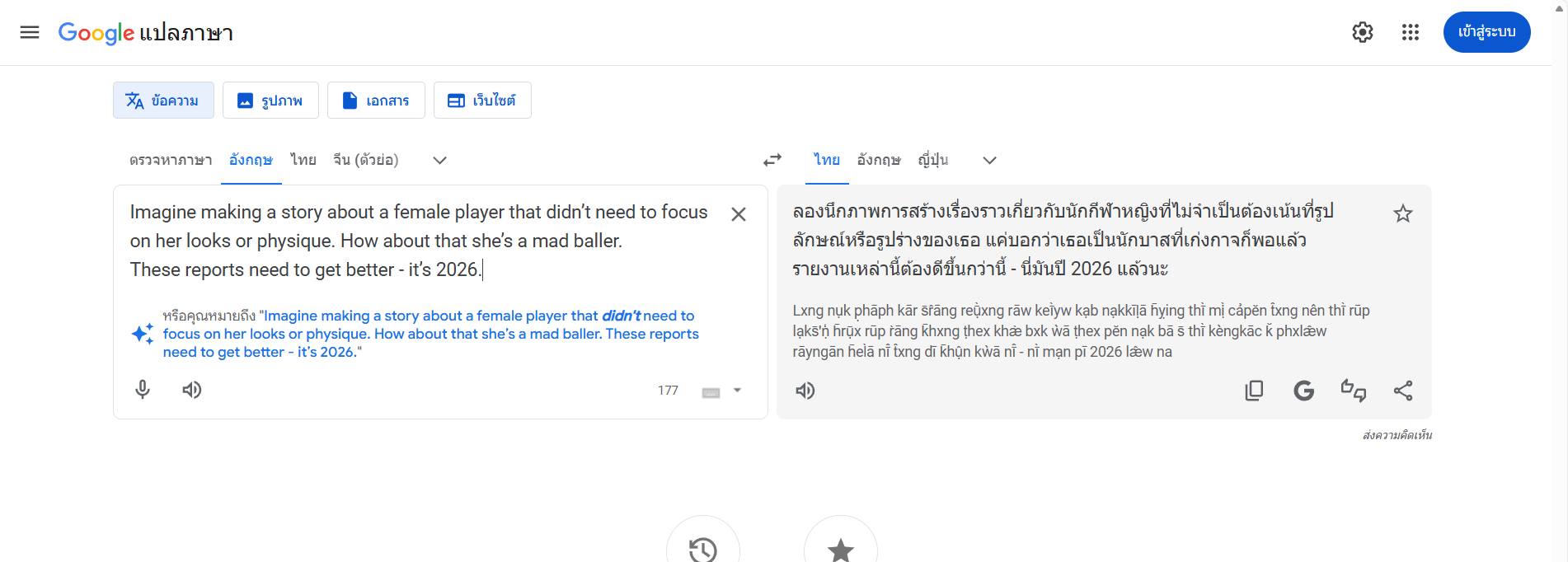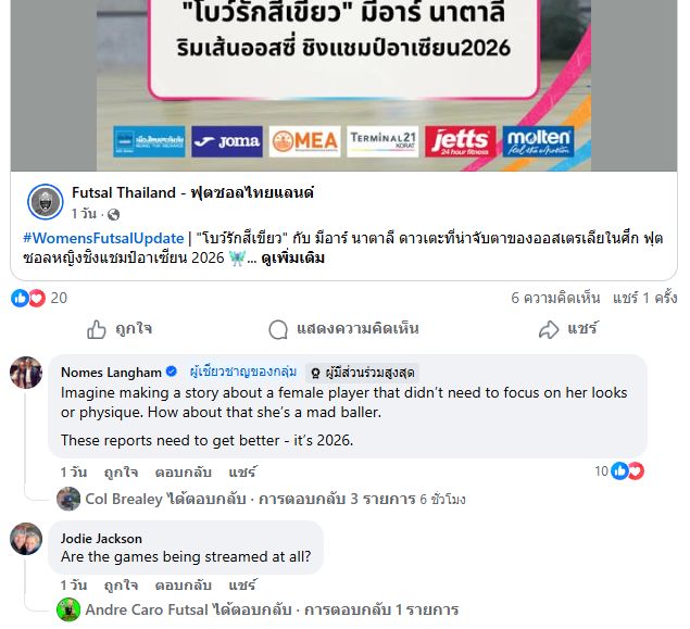 ชาวต่างชาติคอมเมนต์เพจOfficialทางการฟุตซอลไทยว่า สร้างเรื่องราวนักกีฬาหญิงไม่จำเป็นต้องเน้นที่รูปลักษณ์หรือรูปร่างของเธอ แค่บอกว่าเธอเป็นนักฟุตซอลที่เก่งกาจก็พอแล้ว