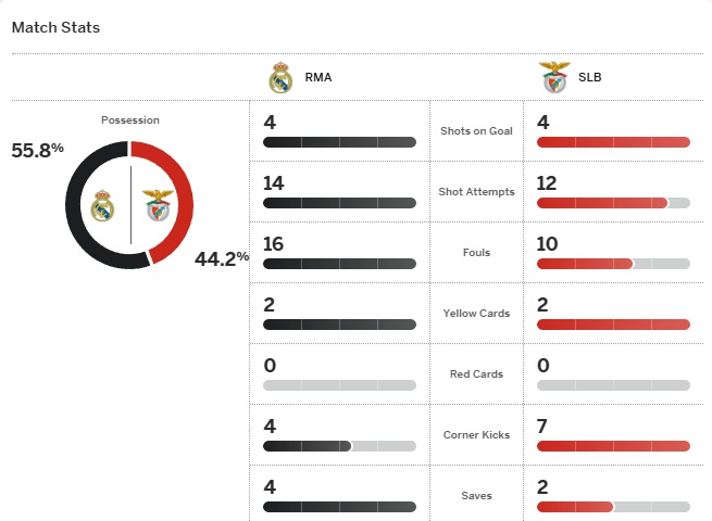 ราชันชุดขาว เรอัล มาดริด ยัดเยียดความปราชัยให้เบนฟิก้าอีกครั้ง เมื่อเปิดบ้านชนะ 2-1 จากผลงานทำประตูของ อเรลิยอง ชูอาเมนี่ (น.16) และ วินิซิอุส จูเนียร์ (น.80) ตีตั๋วผ่านเข้ารอบน็อกเอาท์ 16 ทีมสุดท้ายสกอร์รวม 3-1 โดยเกมนี้ทีมราชันต้องเจอกับข่าวร้าย ราอูล อเซนซิโอ เจ็บหนักต้องบล็อคคอขึ้นเปลหามออกจากสนามช่วงนาที 72