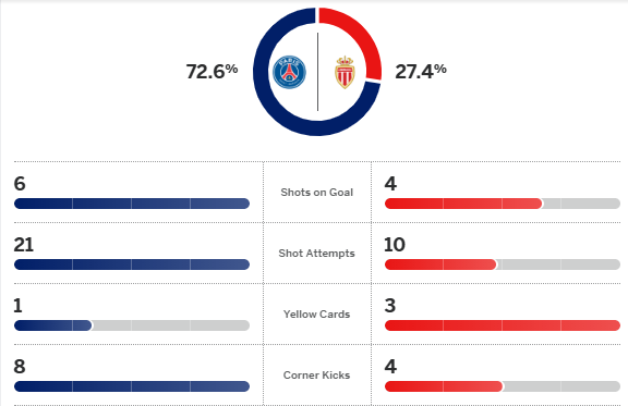 โมนาโก นำก่อนนาที 45 แต่ก็เหมือนเลกแรก คือต้นครึ่งหลังโดนใบแดง ปารีส แซงต์-แชร์กแมง คนมากกว่ารัวแซงจาก มาร์ควินญอส และ ควิชา ควารัตส์เคเลีย แม้ทดเจ็บแชมป์เก่าเสียประตู ได้แค่เปิดรังเจ๊าอริร่วมฝรั่งเศส 2-2 ยังพอเข้ารอบ 16 ทีม แชมป์เปี้ยนส์ ลีก สกอร์รวม 5-4 รอจับเจอ เชลซี หรือ บาร์เซโลน่า